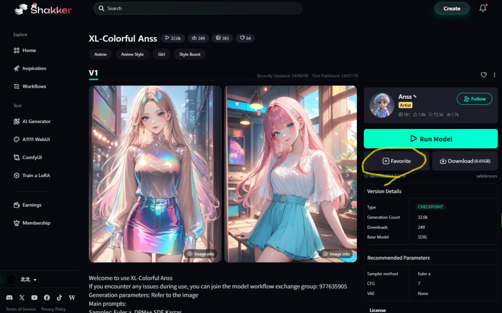 使いたいLoRAがある場合には、モデル同様にLoRAの詳細ページから「Favorite」ボタンを押してお気に入り登録しておきます。
