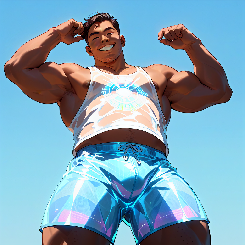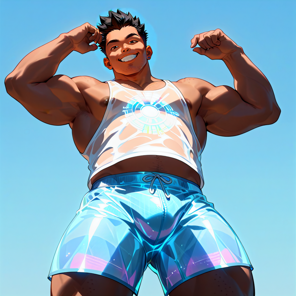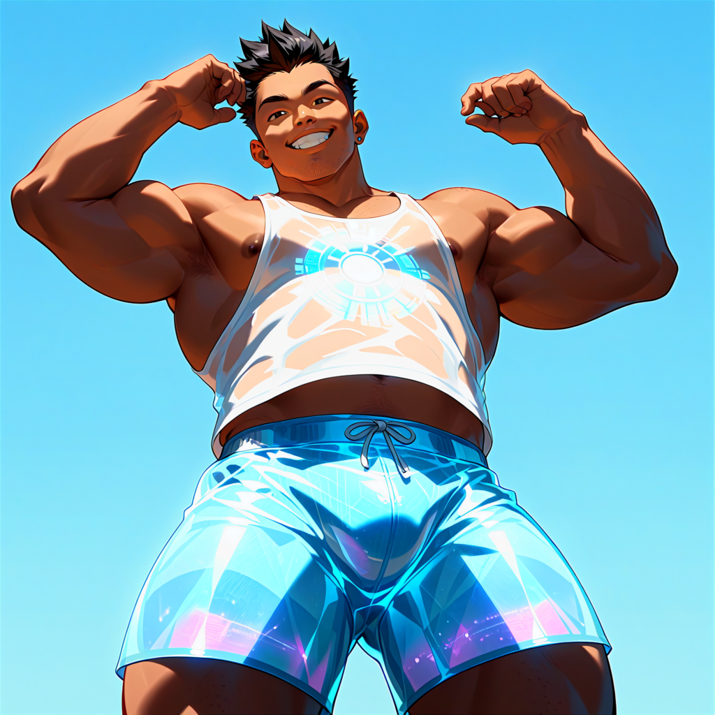 txt2imgで生成した状態。LoRAの影響でタンクトップと短パンのホログラフィック感は見事ですが、顔が潰れてしまっています。